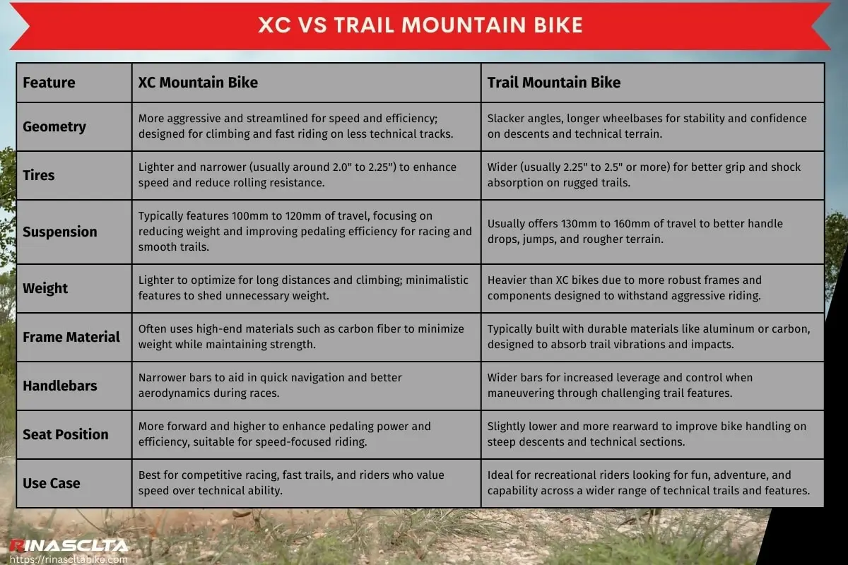 - Trail: Built to handle a variety of terrains, trail bikes often have moderate suspension travel, making them versatile for both climbing and descending different landscapes.